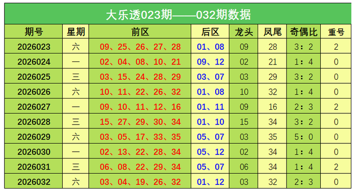 大乐透第2026032期出奖号统计:前区03、04、19、26、32,后区01、12。龙头03,凤尾32,奇偶比2:3,未开出重号。
