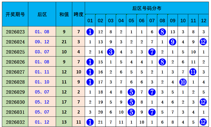 上期后区开出奖号01、12,冷热比0:2,近10期冷热比中,0:2出现4次,1:1出现5次,2:0出现1次,总体热码开出较多。笼统分析,本期关心冷热比1:1。