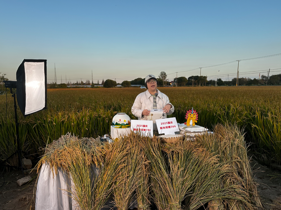 浦江新农东谈主、好意思食博主珑妈在稻田庐直播。