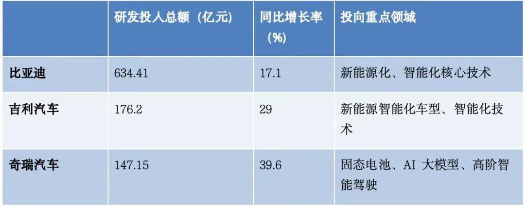研发干预上行,是这三家企业年报中的另一条共同干线:比亚迪2025年研发干预达到634.4亿元,同比增长17.1%,占营收比重7.21%,主要聚焦新能源化(电板时刻、电动平台)及智能化(AI大模子、高阶驾驶接济);祯祥汽车2025年公司研发用度(含老本化部分)以为176.2亿元,同比增长29%,主要用于新能源智能车型的引诱及智能化时刻的深耕;奇瑞汽车研发干预约147.15亿元,同比增长39.6%,其中,研发开支114.44亿元。