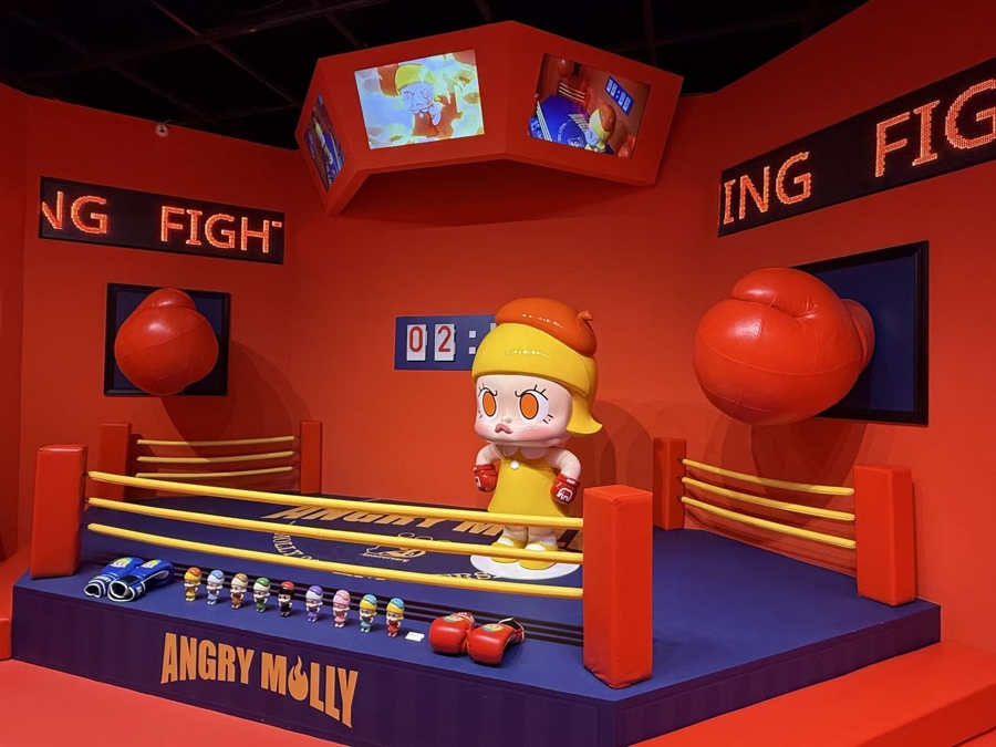 本次特展中最成心念念意念念的部分,则莫过于Baby Molly、Angry Molly、SPACE MOLLY等不同形象与扮装的主题展厅。通过搭建出一个个作风迥异的千里浸式场景,主题展厅不仅讲明着不同MOLLY形象所代表的设想、童真、勇敢与看护等精神内核,也为不雅众提供了打卡“出片”的绝佳机位。如Baby Molly展厅叮嘱了巨型书桌,不雅众仿佛走进了常人国;Angry Molly展厅诞生了拳击擂台,还贴心肠提供了拳击手套,不雅众不错上台和Molly“切磋”一番。SPACE MOLLY展区则叮嘱成了深重的星际,还展出了首个“冲出地球”的手办——昨年,一个银色镀面的MOLLY随谷神星一号运输火箭参预天外,本年又搭乘力鸿一号遥一飞行器复返,成为首个收尾天外走动的原创潮玩IP。