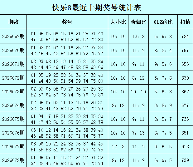 福彩景况8第2026078期开奖回想:01 06 07 11 15 21 24 27 31 32 34 38 46 49 52 60 67 71 73 74,其中奖号奇偶比开出11:9,大小比开出8:12,012路比开出6:9:5,和值为739,跨度为73。