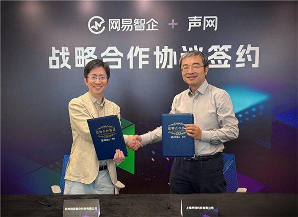 网易副总裁、网易智企总司理阮良,声网首创东说念主兼CEO赵斌代表两边坚韧政策合作契约。
