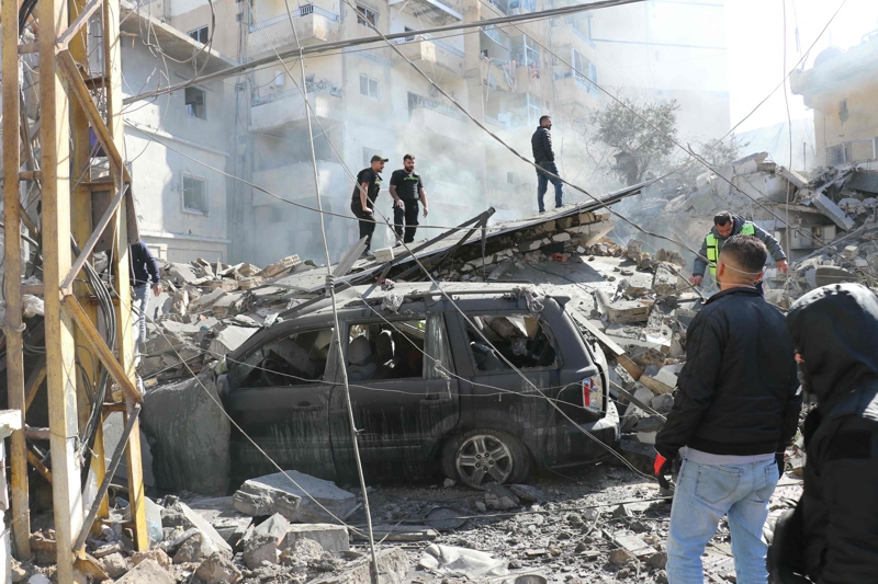 3月24日,在黎巴嫩南部城市提尔,救济东谈主员在一处以军空袭现场责任。 新华社/法新