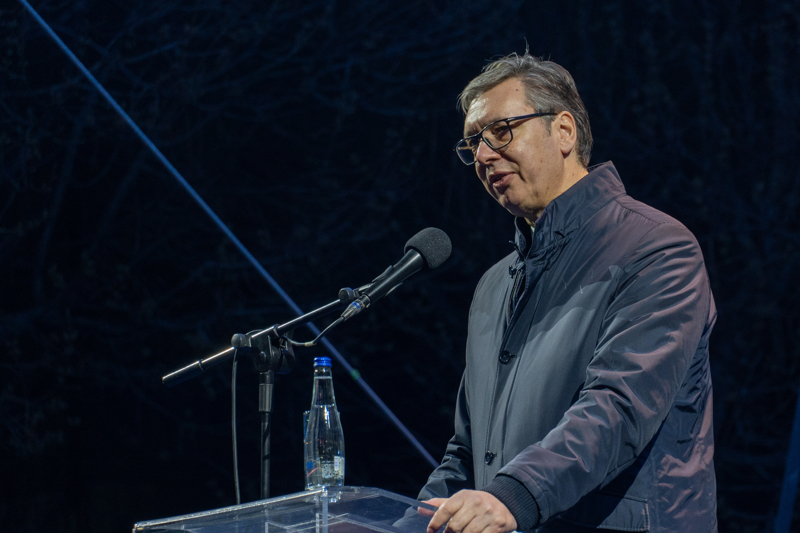 3月24日,塞尔维亚总统武契奇在弗拉涅举行的磋议上发表话语。 新华社发(内马尼亚摄)