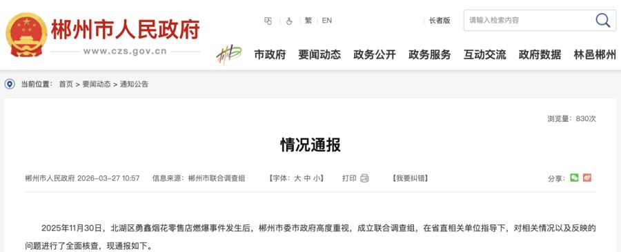 3月27日,湖南省郴州市东说念主民政府网站发布情况通报: