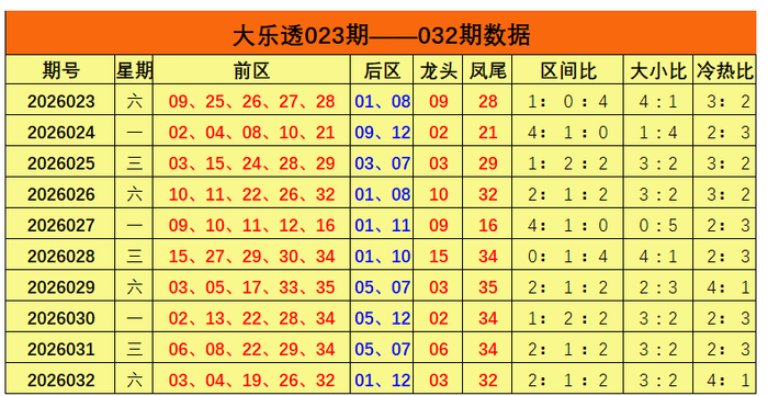 大乐透第2026032期出奖号统计:前区03、04、19、26、32,后区01、12。龙头03,凤尾32,区间比2:1:2,大小比3:2,冷热比4:1。