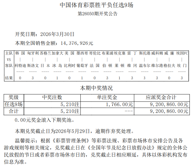 北京时分3月30日,输赢彩第26050期任九开奖成果揭晓。本期任九开出5210注,单注奖金1766元。本期任九投注总和为14,376,926元。