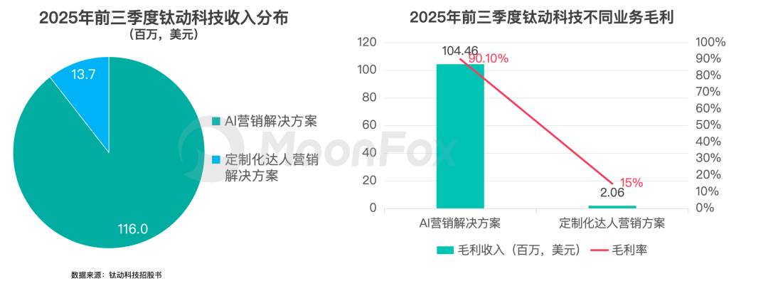 而钛动科技则聚焦于中国企业出海业务,侧重于投放获客,2025年推出营销智能体Navos。2025年前三季度营收1.3亿好意思元,毛利率达到82%,经调养净利率为44%。总收入按照业务类型永诀,AI营销惩办决策占主导,占比89.5%。