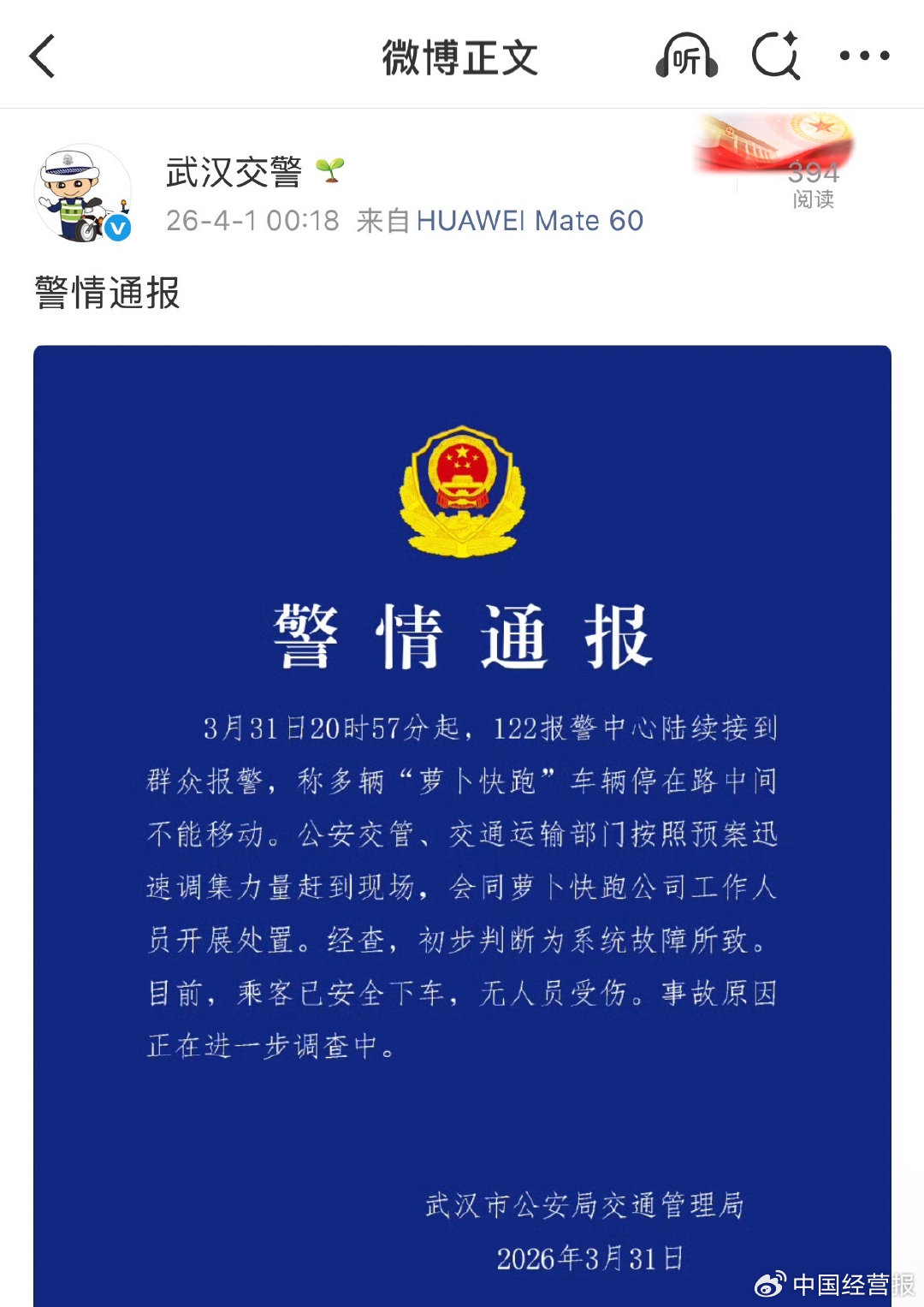 4月1日凌晨00:18,武汉市公安局交通管制局通过“武汉交警”官方微博账号发布警情通报称,3月31日20时57分起,122报警中心络续接到公共报警,称多辆“萝卜快跑”车辆停在路中间不可转移。