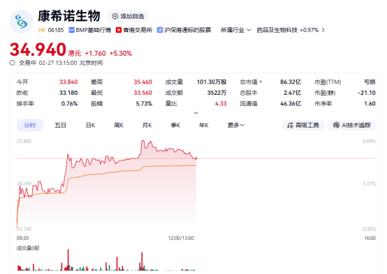 上证报中国证券网讯(李子健 记者 周亮)2月27日,康希诺生物股价颠簸走高,汗漫13时15分,公司股价飞腾5.30%,报34.94港元/股。