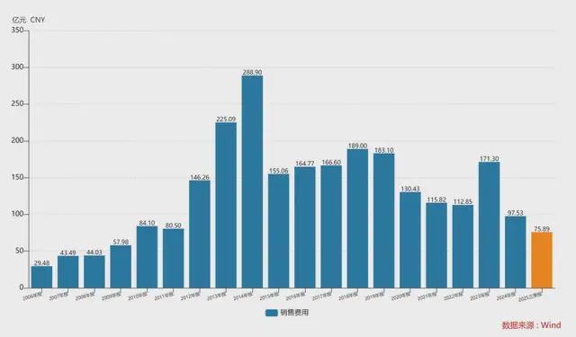 最彰着的即是销售用度,2014年的本事,格力的销售用度还高达288.90亿元,而近些年则基本督察在百亿元隔邻,2024年更是跌至了百亿元下方;2025年前三季度,销售用度进一步压缩了11.3%,惟有75.89亿元。