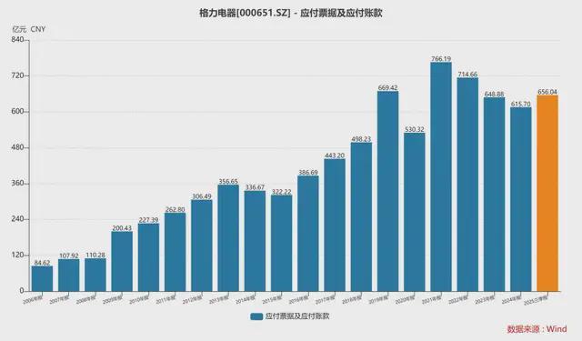 从统统值来看,2021年以来,格力电器的搪塞账款基本督察在600亿元以上,2025年第三季度更是达到了656.04亿元,不是个少量目。