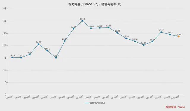 格力这些年的销售毛利率,基本呈现颤动下落的趋势。