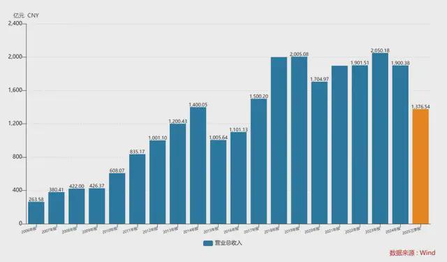 2025年前三季度营业收入同比下落6.62%,为1376.54亿元。
