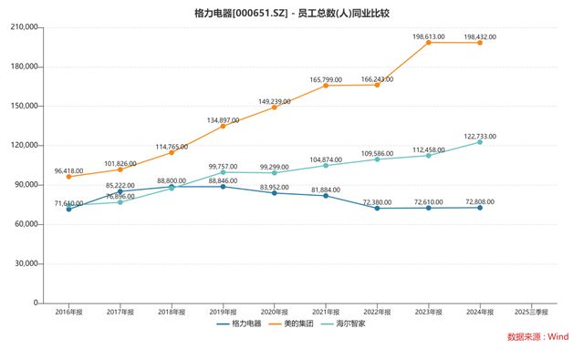 据数据解析,格力的职工东谈主数在2018年达到顶峰,有8.88万东谈主,跟好意思的集团、海尔智家处于合并梯队;可时于本日,格力的职工缩减至7.28万东谈主