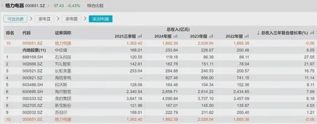 据数据解析,格力近3年总收入复合增长率为-0.06%,别说增长,致使还略有倒退。而这一数据,在家用电器上市公司收入前十的公司中,格力排行倒数第一。